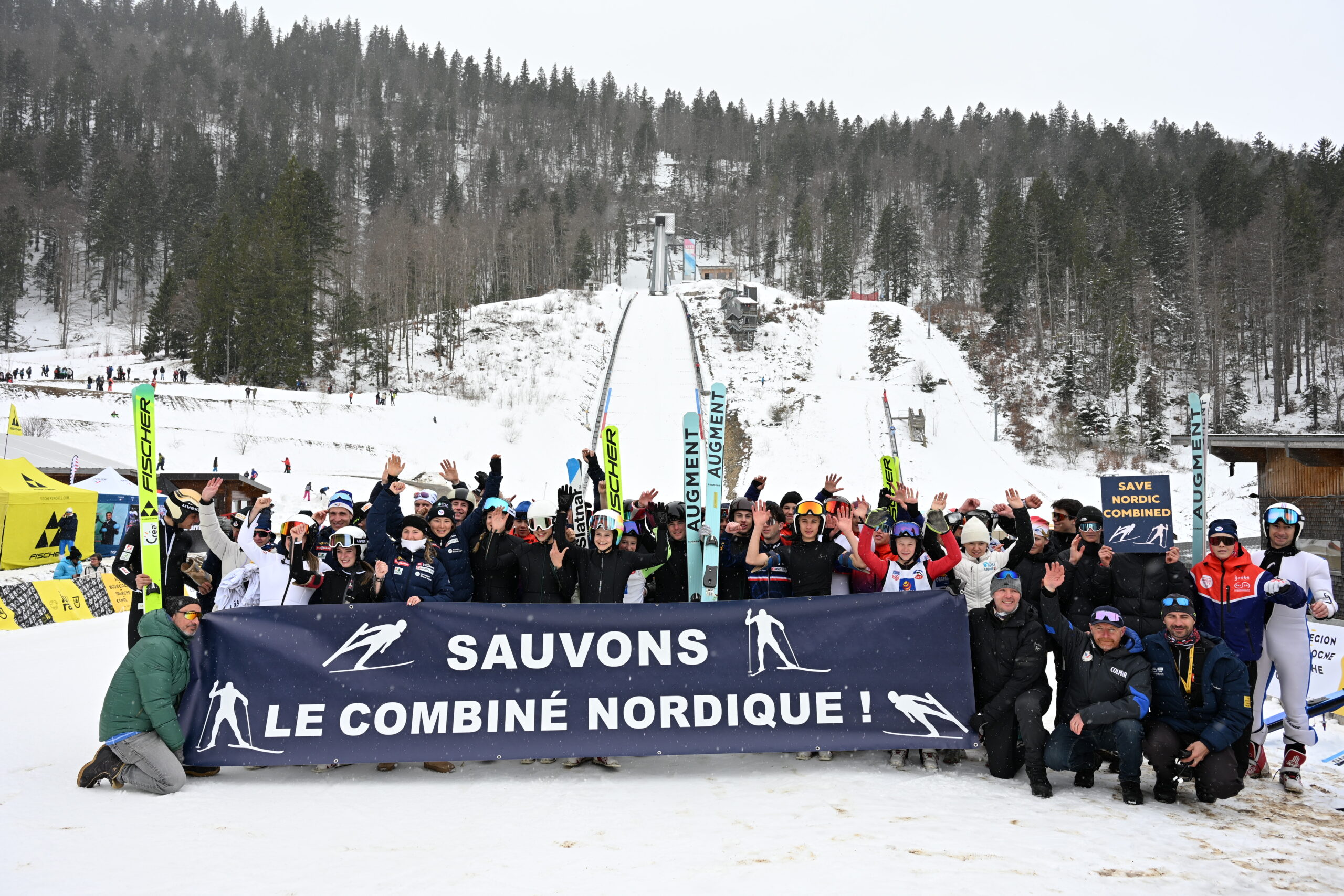 Des dizaines d’athlètes étaient réunis ce week-end à Prémanon (Jura), terre d’accueil des Championnats de France de biathlon et de combiné nordique. Le moment parfait pour manifester en faveur du maintien du combiné au programme olympique. Samedi, les athlètes se sont rassemblés au pied du tremplin derrière une banderole géante où l’on pouvait lire « Sauvons le combiné nordique ! »