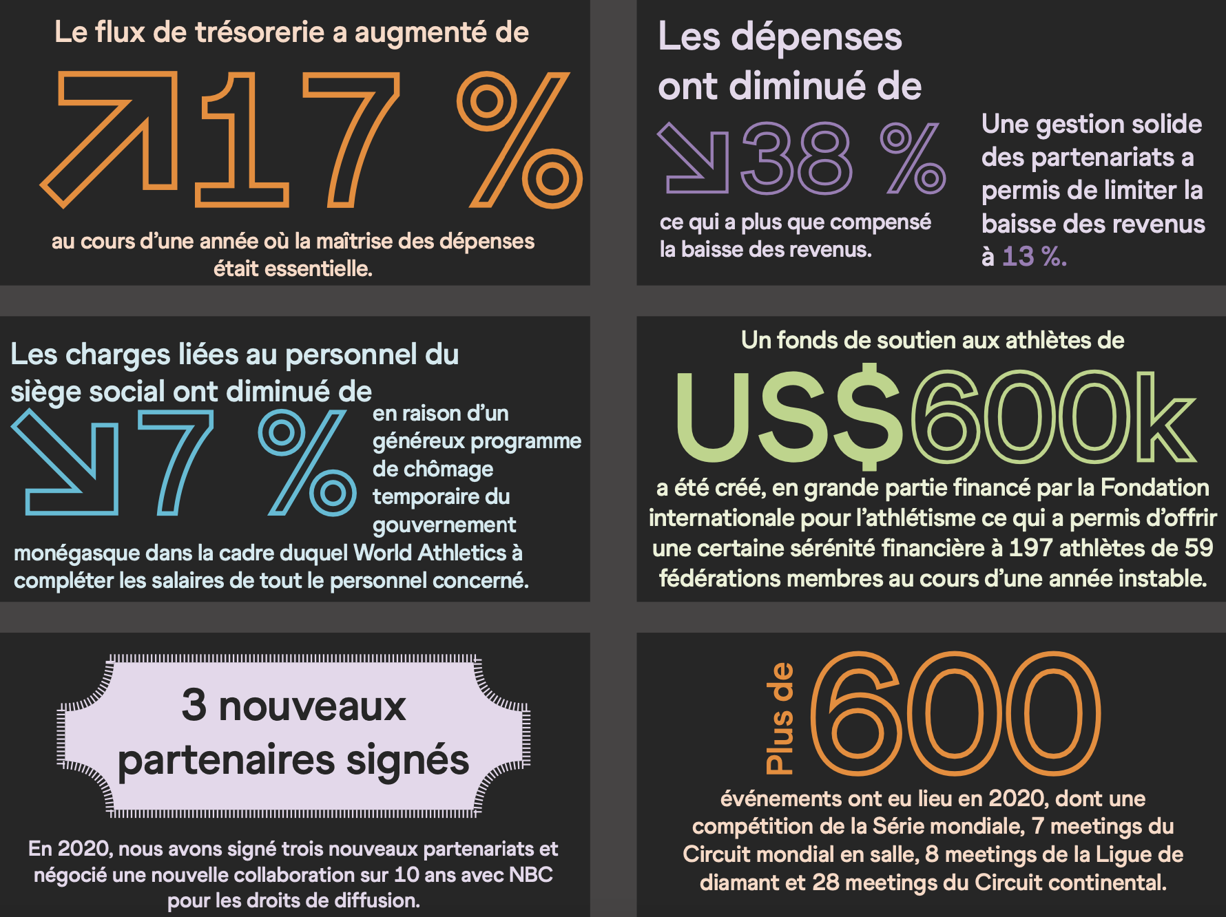 La saison touche à sa fin pour l’athlétisme international. World Athletics en profite pour publier ses comptes annuels. L’instance basée à Monaco a dévoilé via un communiqué son rapport financier pour l’année 2020. Il aurait dû marquer le début d’un nouveau cycle de financement de quatre ans, lié pour l’essentiel à la dotation du CIO, mais le report des Jeux de Tokyo a décalé le cycle d’une année. World Athletics l’explique : la situation très particulière vécue l’an passé l’a poussée à se concentrer sur la protection de ses revenus et la réduction des dépenses. La stratégie s’est révélée payante, avec des réserves de trésorerie en hausse de 17 % à 40 millions de dollars américains. Les dépenses ont diminué de 38 %, passant de 67,8 millions en 2019 à 41,7 millions en 2020. Un résultat obtenu en partie grâce à la réduction des dépenses liées aux compétitions (- 49 %), la baisse des subventions aux associations continentales et aux fédérations nationales (- 48 %), une mise en chômage partiel d’une partie du personnel et une réduction massive des frais de voyage non liés à un événement (- 85 %). Bilan : un chiffre d’affaires en baisse de seulement 13 % (44,2 millions de dollars en 2020, contre 51,1 millions une année plus tôt). World Athletics l’explique : « Le maintien des revenus des droits de diffusion et des droits commerciaux, grâce au report plutôt qu’à l’annulation des événements, a permis de dégager un produit de 34,9 millions de dollars au cours d’une année difficile. Les recettes ont également été alimentées par 6,8 millions de dollars provenant de la Fédération russe d’athlétisme. » L’instance note également avoir réussi en 2020 à attirer trois nouveaux partenaires – Pinsent Masons, parkrun et Nielsen -, et organisé les championnats du monde de semi-marathon à Gdynia, en Pologne, ainsi que plus de 600 épreuves individuelles dans le monde, dont huit meetings de la Ligue de diamant et 28 étapes du Circuit continental.