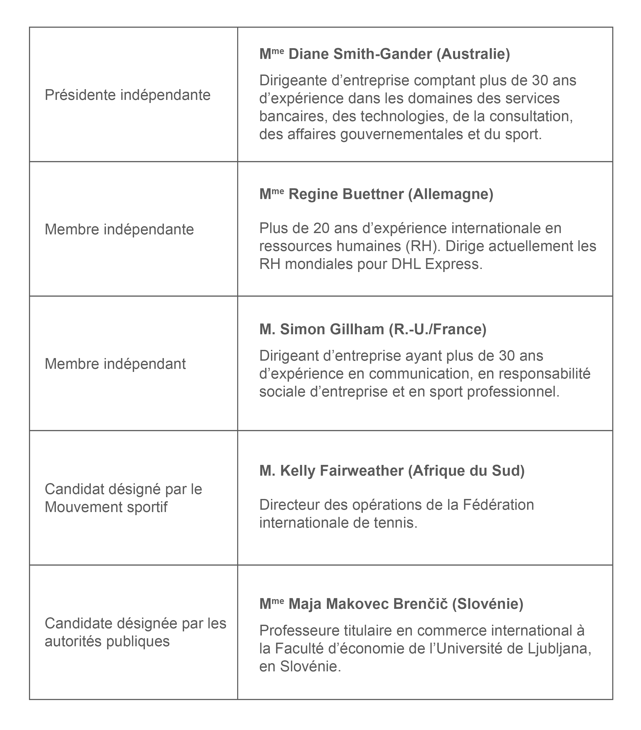 En septembre 2019, le Comité exécutif de l’Agence a approuvé la nomination des membres ci-dessous. Ceux-ci ont été identifiés, recrutés, confirmés et recommandés au Comité exécutif par Korn Ferry, une agence externe dont l’AMA a retenu les services à cette fin précise avec l’approbation du Comité exécutif en mai 2019.
